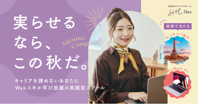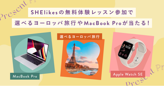 学ぶから働くまでをサポートする日本最大の女性向けキャリアスクール「SHElikes(シーライクス)」を運営するSHE株式会社(所在地:東京都港区、代表取締役CEO:福田恵里、以下SHE)は、無料体験レッスン参加でヨーロッパ旅行やMacBook Proが当たる秋のキャンペーンを2023年10月1日(日)から11月30日(木)の期間で実施します。