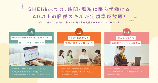 SHElikesは、時間や場所にとらわれずに働ける40以上の職種スキルが定額で学び放題の女性向けキャリアスクールです。Webデザイン・Webマーケティング・ライティングなど、パソコン一つで働けるデジタルスキルやクリエイティブスキルを学ぶことで、私らしい働き方の実現を支援します。