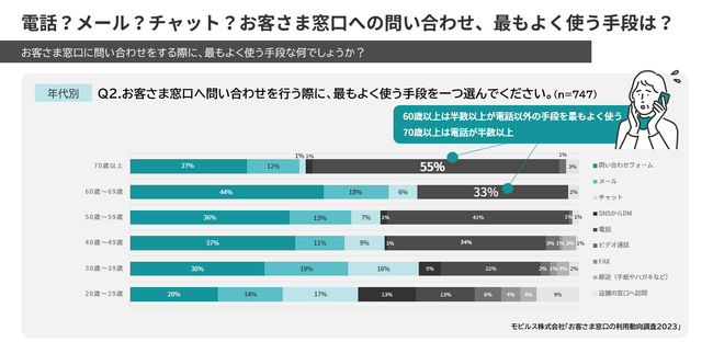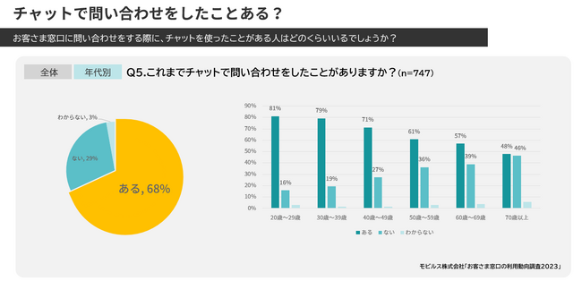 高年層の60代で57%、70歳以上でも48%がチャットでの問い合わせ経験があると回答したのは、注目すべき結果です。