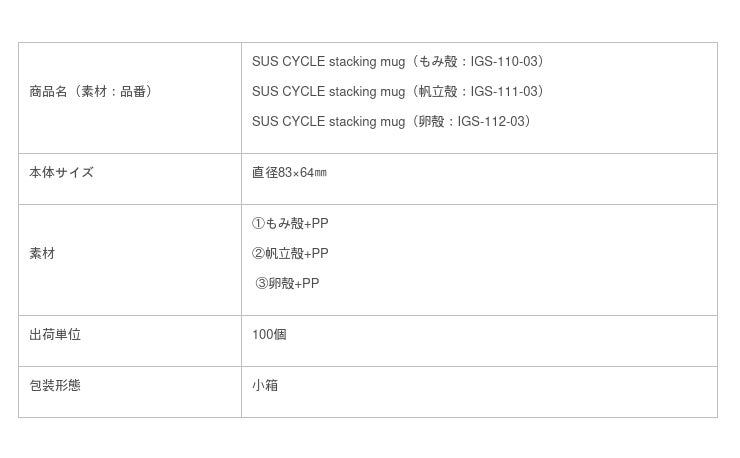 SUS CYCLE stacking mugは、もみ殻・帆立の殻・卵の殻など、日本各地で廃棄される食品廃棄物を51%再利用した、積み重ね可能なマグカップです。収納場所を取らないため室内でのご使用はもちろん、キャンプなどアウトドアでの持ち運びにも便利です。廃棄物51%は、当社の過去20商品以上のサステナブルグッズの中でも最も多い含有率であり、環境にやさしい製品となっています。さらに割れづらい特性も兼ね備えており、耐久性の面でも安心してご使用いただけます。