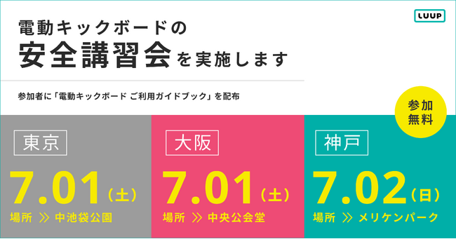 電動キックボードや電動アシスト自転車などの電動マイクロモビリティを取り扱うシェアリングサービス「LUUP(ループ)」を展開する株式会社Luup(本社:東京都千代田区、代表取締役社長兼CEO:岡井大輝、以下「Luup」)は、警視庁池袋警察署、大阪府警察、東京海上ホールディングス(本社:東京都千代田区、取締役社長グループCEO:小宮暁)、兵庫県警察、神戸市役所の協力を得て、電動キックボードの安全講習会を中池袋公園(東京)、中央公会堂(大阪)で7月1日(土)に、メリケンパーク(神戸)で2日(日)に開催します。当日は、電動キックボードの新しい交通ルールのレクチャーや安全な走行方法をお伝えし、実際にご試乗いただくことが可能です。