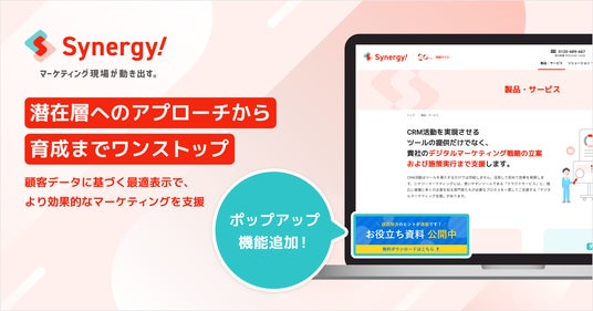 マーケティングSaaS「Synergy!(シナジー)」を提供するシナジーマーケティング株式会社(本社:大阪市北区、代表取締役社長 兼 CEO:奥平 博史、以下当社)は、「Synergy!(シナジー)」に、Webサイト上のユーザー行動に応じてメッセージを表示できる「ポップアップ機能」を搭載しました。