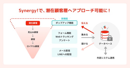 従来のSynergy!は、主にリード獲得後の顕在層に対するマーケティング施策(メール配信、アンケート、ナーチャリングなど)に強みがありました。今回のポップアップ機能追加により、Webサイト訪問時の顕在層だけでなく、「潜在層」の瞬間的な関心も捉え、シームレスな顧客体験へとつなげることが可能になります。