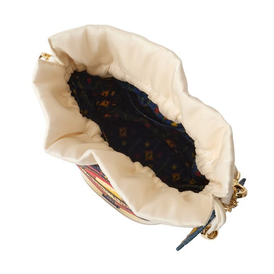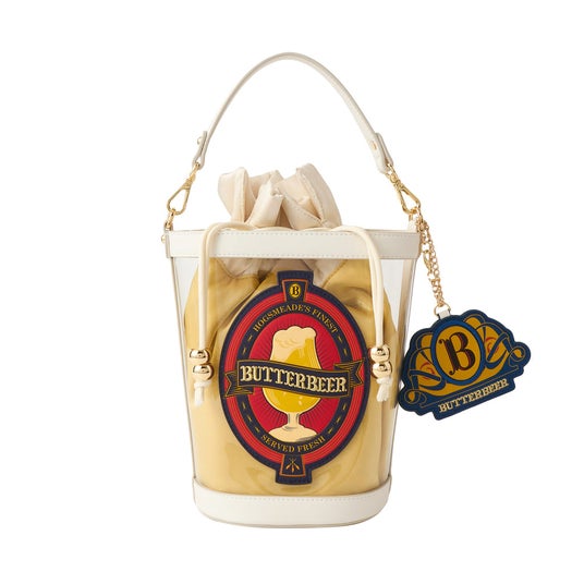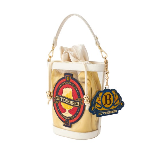 クリアバッグはグラスをイメージし、中の巾着でバタービールを表現しています。泡のふわふわ感が表現できるよう光沢感のあるオーガンジーを重ね、巾着を絞ったときにふわっとなるよう試作を重ねたこだわりのデザインです。バタービールモチーフのミラーチャーム付き。