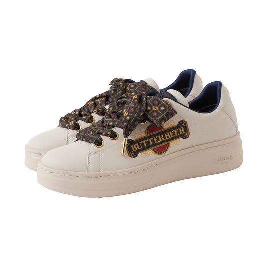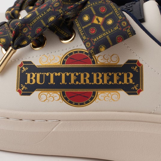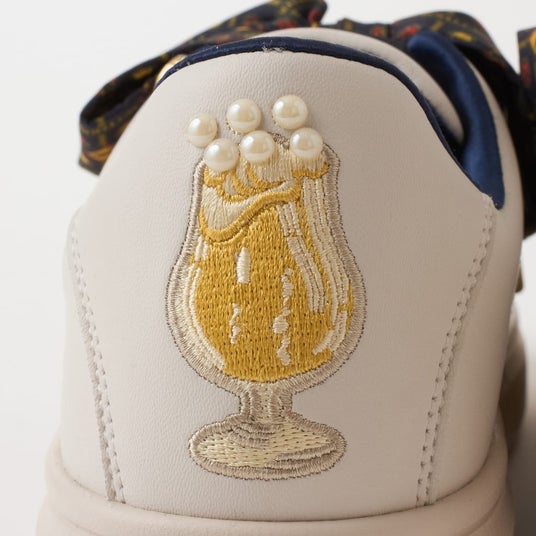 バタービールのモノグラム柄を繊細にプリントしたスカーフ、サイドにはクラシカルなロゴプリントを効かせたスニーカー。バタービール瓶の蓋モチーフの精巧に作りこまれたミニチュアパーツや、踵のバタービールグラス刺繍もポイント。泡はぷっくりとしたパールで立体的に表現し、細部までこだわりが詰まっています。