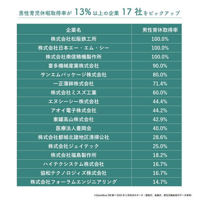 本調査は、日本に存在する企業を対象(男性育児休業対象者が5名以上)に、男性育児休暇取得率が13%以上の企業について調査しました。