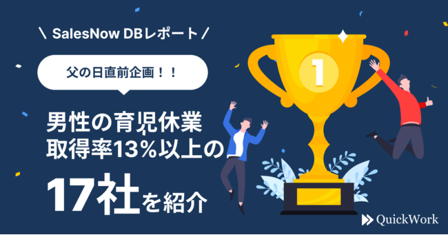 「データとテクノロジーで、ビジネスを加速させる。」をミッションに掲げ、日本全国約510万社の企業データを基盤に営業の効率化を支援する「SalesNow」を展開してきた株式会社QuickWork(本社:東京都渋谷区、代表取締役:村岡 功規、以下「QuickWork」)は、日本最大級のデータベース「SalesNow DB」のデータを活用した「SalesNow DBレポート」から、今回は「男性育児休暇取得率が13%以上の企業17社」をピックアップしてご紹介します。