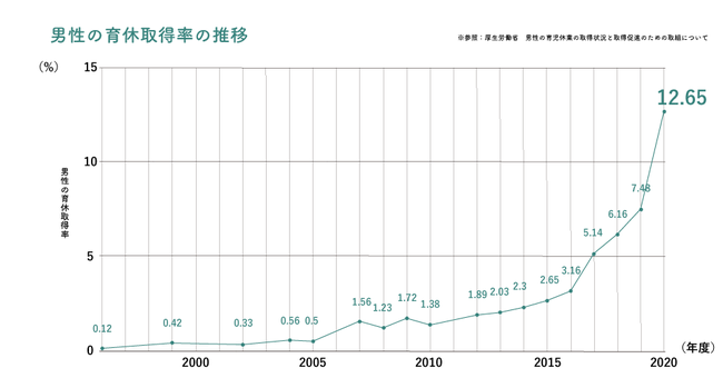 厚生労働省が発表している「令和2年度雇用均等基本調査」によると、2020年度の男性の育児休業取得率は12.65%となっており、2019年度(7.48%)と比較すると増加の傾向にあります。コロナ禍によりステイホームやテレワークの働き方が推進されたことによる環境整備も取得しやすい要因の一つになっているかもしれません。