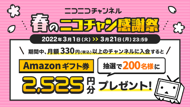 期間中、月額330円(税込)以上のニコニコチャンネルに1つ以上入会してご応募いただくと、抽選で200名様にAmazonギフト券2,525円分が当たります。