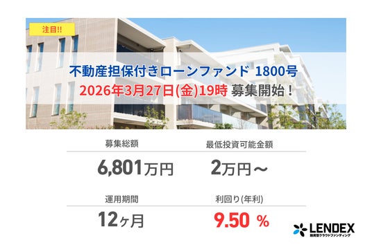この度、融資型クラウドファンディング「レンデックス(LENDEX)」を運営する株式会社LENDEX(本社:東京都渋谷区、代表取締役:中村 智)は、年利9.5%の不動産担保付きローンファンド1800号を本日2026年3月27日の19時に募集開始することをお知らせします。