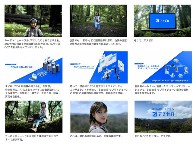 ブランドムービーには、企業が一丸となってCO2排出削減に取り組んでいきたいという当社が目指す未来を「CO2排出量削減は、明日の地球を守るための企業の責務である」というメッセージとともに届けていきます。そして、CO2排出量見える化・削減・報告クラウドサービス「アスゼロ」の提供により、グローバルにカーボンニュートラルの取り組みをさらに加速させていきます。