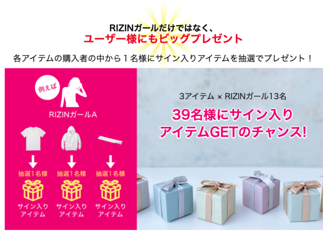 RIZINガール総勢13名によるオリジナルデザイングッズの販売バトルが開催されます。投票の結果、上位入賞を果たしたRIZINガールは渋谷の街頭ヴィジョンに出演します!オリジナルグッズの購入やツイッター投稿など誰でも気軽に投票できるユーザー参加型イベントになっています。あなたの推しのRIZINガールを応援してグランプリに輝かせよう!
