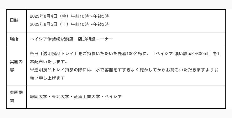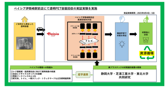 株式会社ベイシア(本社:群馬県前橋市、代表取締役社長:相木孝仁)は、8月4日(金)、5日(土)の2日間、ベイシア伊勢崎駅前店にて透明食品トレイ回収の社会実験・分別実証実験を実施いたします。世界各国で「廃プラ」問題が注目される中、特に「廃プラスチックの素材」を正確に識別・選別し、再生資源として有効利用することが必要とされています。静岡大学・東北大学・芝浦工業大学はそうした目的・課題を持ち共同でテラヘルツ波※による素材識別装置の開発を行っており、その実証実験に今回当社が参画いたします。持続可能な社会の創造を目指した産学連携の取り組みです。
