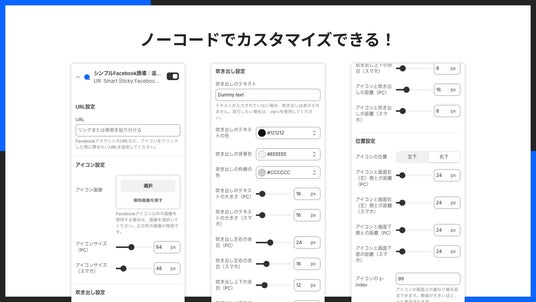 アイコンのリンク先、位置、サイズ、カラーなどをノーコードで設定できます。HTML や CSS の知識がなくても、管理画面から簡単にデザインを整えられます。直感的なインターフェースにより、リアルタイムでプレビューを確認しながら調整できるため、理想的な表示を簡単に実現できます。カラーピッカーを使用してブランドカラーに完全にマッチした色を選択したり、アイコンのサイズを細かく調整したりすることで、ストア全体のデザインと調和の取れた表示が可能です。さらに、カスタムアイコンのアップロード機能により、デフォルトのFacebookアイコンだけでなく、ブランド独自のデザインアイコンを使用することもできます。