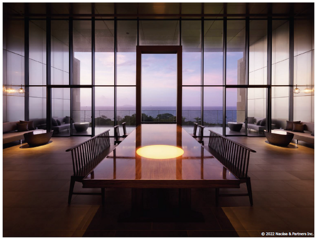 五島列島は、歴史的に遣唐使の寄港地や潜伏キリシタンの地として独自の文化が醸成されてきた地域であり、本ホテルは、長年地元で大切にされてきた風景との調和や地域の歴史と文化の体現を目指し、建物の外観だけでなく、室内から望む景色や外の風景を映し込むロビーなどの内装もデザインしています。