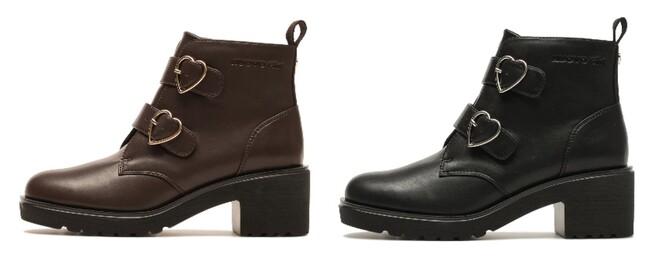ヒールで大人っぽく、ハートバックルが女の子らしいショートブーツです。ゴツめのソールとダブルベルトが、コーディネートに