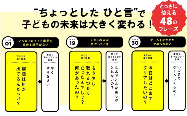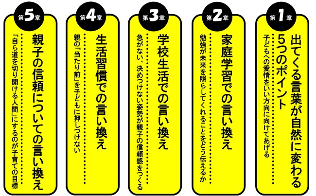本書を読めば、家庭学習・親子の信頼関係・学校生活などの各シーンで「言ってしまいがちな言葉」を、「子どもに届く言葉」に変換できるのです。