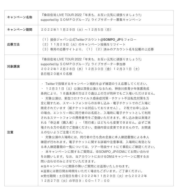 損害保険ジャパン株式会社(取締役社長:白川 儀一、以下「損保ジャパン」)は11月29日(火)から、損保ジャパン公式Twitterアカウントにて、横浜アリーナにて開催される本ツアーの追加公演『桑田佳祐 LIVE TOUR 2022「年末も、お互い元気に頑張りましょう!!」supported by SOMPOグループ』ライブサポーター募集キャンペーンを実施します。