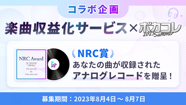 2023年8月4日(金)~7日(月)に開催する「The VOCALOID Collection ~2023 Summer~」(以下、ボカコレ)と連動したスペシャル企画として、ボカコレ開催期間内でオリジナル楽曲を投稿かつ楽曲収益化サービスへ申請した方の中から受賞者10名様に、「NRC賞(楽曲収益化サービス賞)」として、受賞者が投稿した楽曲が収録されたアナログレコードとレコードプレーヤーを授与します。