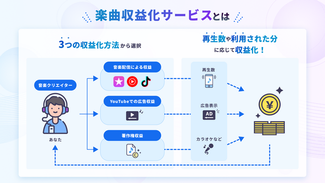 「楽曲収益化サービス」は、これまで日本ネットクリエイター協会(JNCA)の設立などクリエイターの創作活動を支援してきたドワンゴが手がける音楽クリエイター向けのサービスで、クリエイターがより創作活動に集中できるようサポートします。同サービスは、誰でも登録料・年会費が無料で1曲から利用可能で、オリジナル楽曲を申請するだけで、Apple Music、Spotify、TikTokなど複数の音楽サブスクやSNSでの配信~収益化まで、面倒な手続きを省くことができます。また、収益化方法については、音楽配信による収益をはじめ、YouTubeでの広告収益、著作権収益の3つの手段が利用できます(本サービスの利用は18歳以上が対象)。