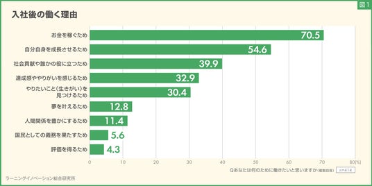結果、「お金を稼ぐため」が70.5%で最大の割合となり、「自分自身を成長させるため」が54.6%と半数以上の内定者が回答する結果となりました。次いで、「社会貢献や誰かの役に立つため」が39.9%、「達成感ややりがいを感じるため」が32.9%、「やりたいこと(生きがい)を見つけるため」が30.4%と続きました。(図1)