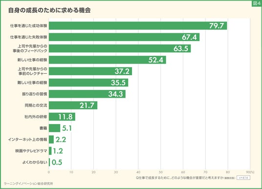 結果、「仕事を通じた成功体験」が79.7%でトップとなりました。次いで「仕事を通じた失敗体験」が67.4%、「上司や先輩からの事後のフィードバック」が63.5%となりました。(図4)