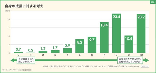 まず、成長意欲に関する質問では、どちらかといえば「成長よりも楽しければよい」という考えよりも、「大変なことがあっても変化・成長していきたい」と考える傾向があることが明らかとなりました。