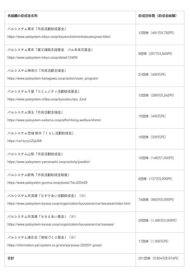 パルシステムグループは2022年度、地域で活動するNPOなど221団体へ総額5,804万8,794円を助成しました。不安定な世界情勢が地域の暮らしにも影響をおよぼすなか、市民レベルのつながりを強化し、課題解決に取り組む団体を11の助成制度で応援します。