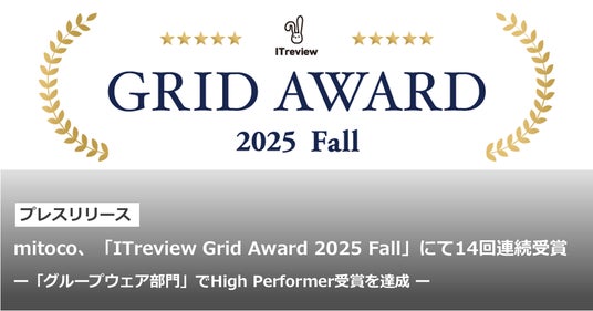 「mitoco」は、2025年10月に発表された「ITreview Grid Award 2025 Fall」の「グループウェア部門」で、顧客満足度の優れた製品に贈られる「High Performer」を14回連続で受賞しました。「High Performer」は、これから認知度が高まっていくことが予想される、いま注目の製品である称号とされています。