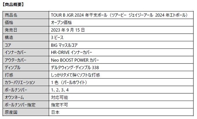 ブリヂストンスポーツ株式会社は、アマチュアゴルファーの飛距離の最大化を追求したゴルフボール『TOUR B JGR』から、2024年の干支である「辰」(たつ)のオリジナルデザインをあしらった、『TOUR B JGR 2024年干支ボール』を9月15日より発売します。価格はオープンです。