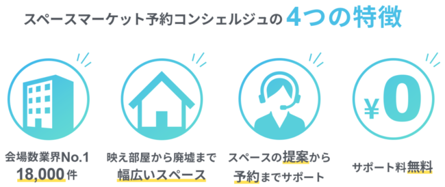 「予約コンシェルジュ」は、知識豊富なコンシェルジュが数ある掲載スペースの中から条件に合うスペースをご提案し、予約までサポートする法人向け無料サービスです。法人アカウントのご案内から候補会場の提案、内見・ロケハンの調整などレンタルスペースを借りる上でのご希望を最適な形でサポートいたします。本サービスでは主に以下のサポートを受けることが可能です。