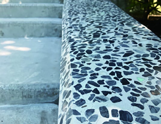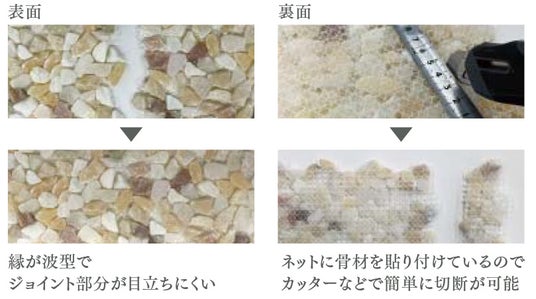 テラゾー仕上げにおいては、特に立ち上がり部やコーナー部の施工が難しく、高度な技術と多くの作業時間を要するため、現場における施工性に課題がありました。今回開発した「HARRUZZO」は、あらかじめ砕石をネットに貼り付けており、平面はもちろんのこと立ち上がり部やコーナー部にもジョイントマットのように簡単に施工できる画期的な製品です。熟練の施工技術を必要とせず、従来に比べ施工時間の短縮や人件費の削減が見込めます。加えて本格的なテラゾー床仕上げと変わらない美しさが大きな特長であり、採用を断念することなく、より多くの現場でこの意匠を取り入れていただけるようになります。
