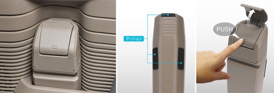 ピッタリ設置できる、ドアポケット専用に設計・デザインしたゴミ箱です。運転席・助手席どちらでも使用でき、ボトルホルダー部のみを使用するため残りのスペースは小物入れとしても使用可能です。「N-BOX JOY」の内装色ブラウンと同じ色になるように調色した樹脂を使用し、ドアポケット内部の質感に近似のシボ加工を施すことで 車両との一体感を向上させています。背面にクッションを貼り付けることで、走行中の振動音を軽減。低い位置に設置しても中身が見えず、開け閉めしやすいワンプッシュオープンのフタを採用。