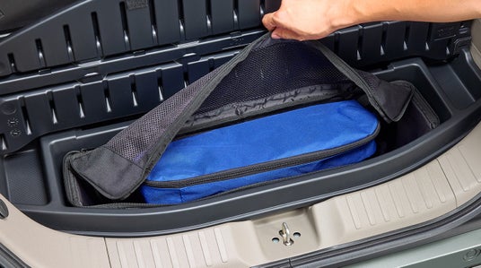 「N-BOX JOY」には荷室にカーゴフロアボックスがあります。本製品はカーゴフロアボックスにバッグを設置して荷物を収納。側面に持ち手がついているため、収納したまま外に持ち出すことができます。レジャー用品、洗車用具、掃除用具、三角停止表示板など、様々なものが入る大容量のバッグです(耐荷重5kg)。また、内装に似合うグレーの杢生地を使用し、天面をメッシュにしたシンプルなデザインとなっています。