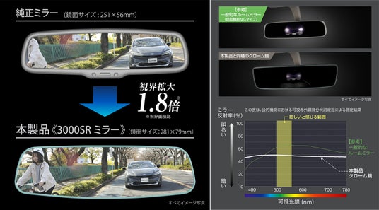 ・広い視界と自然な距離感を両立させた3000SR緩曲面鏡が、横方向はもちろん縦方向にも視界を拡大