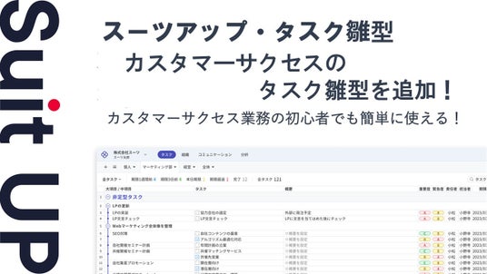 株式会社スーツ(所在地:東京都千代田区、代表取締役社長CEO:小松 裕介)は、チームでかんたん、毎日続けられるプロジェクト・タスク管理ツールの経営支援クラウド「Suit UP」(スーツアップ)にカスタマーサクセスのタスク雛型を追加したことをお知らせします。