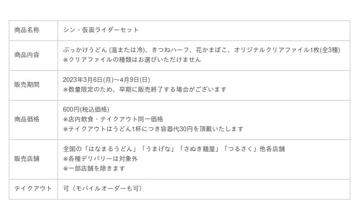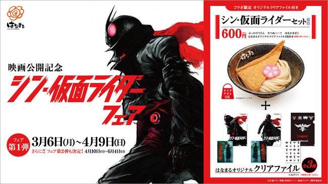 讃岐うどんチェーン「はなまるうどん」を展開する株式会社はなまる(本社:東京都中央区 代表取締役社長:前田良博、以下はなまる)は、2023年3月6日(月)より、全国の「はなまるうどん」「うまげな」「さぬき麺屋」「つるさく」他各店舗(※一部店舗除く)にて、『シン・仮面ライダー』の公開を記念したコラボレーションとして、映画「シン・仮面ライダーフェア第1弾」を開催いたします。