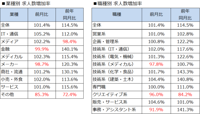 ・業種別では、8業種(「その他」を除く)のうち「IT・通信」「メディア」「メディカル」「商社・流通」「小売・外食」「サービス」の6業種で前月から求人数が増加。