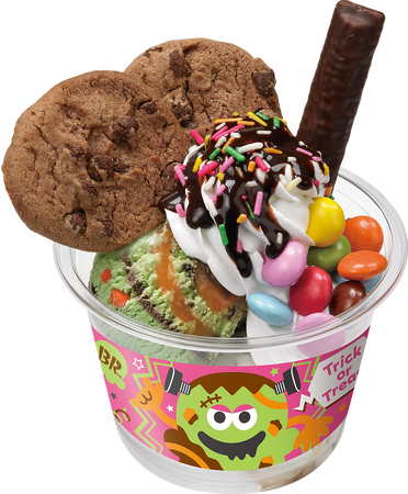 今年の新作ハロウィンフレーバーは、フランケンシュタインをイメージした、ファンキーで楽しいフレーバー♪フランケンの顔をイメージしたグリーンのアイスクリームは香ばしいピスタチオ風味!サーティワン自慢の本格的なチョコレートアイスクリームとハロウィンらしいカラーのキャラメルリボンとの組み合わせが相性抜群です。さらに、ザクザク食感が楽しい、オレンジ色と黒のクッキーがIN!今年のハロウィンはファンキー フランケンで決まりです!