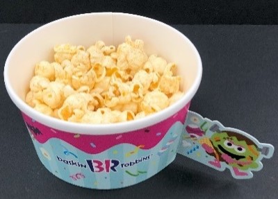 ポップスクープのアイスクリームを4個に、アーチ状のほそなが~いレインボーなマシュマロと魔女の帽子のようなブラックシュガーコーンをのせました!さらにサプライズな、バターしょうゆ味のポップコーン1袋(約16g)を丸々トッピングしました!ホイップやカラースプレー、ハロウィンモンスターたちのピックも飾ったら、あまじょっぱくてわくわくと驚きが詰まったビッグなパーティーサンデーの完成です!
