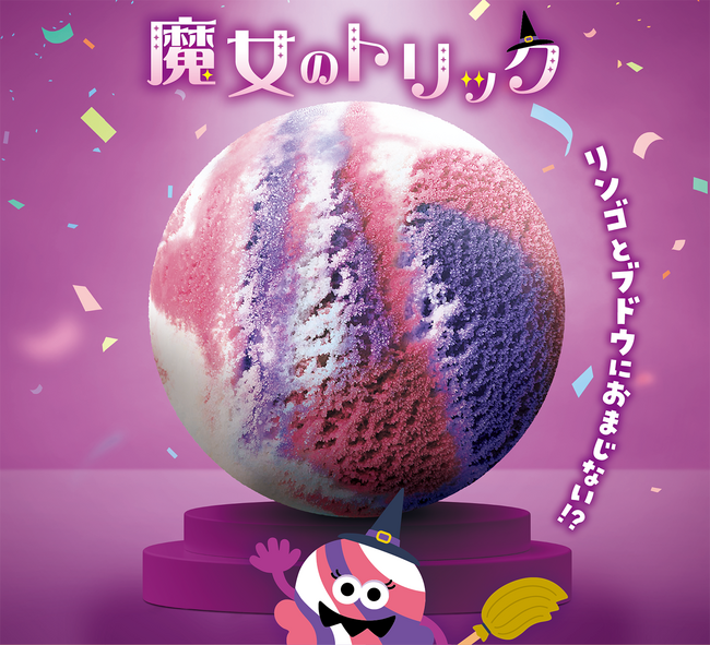 紫・赤・白の色鮮やかなシャーベットは、紫色が赤りんご味で、赤色がグレー プ風味。見た目と色が逆転した、まるで魔女のトリック(いたずら)にかかったような不思議なフレーバー!