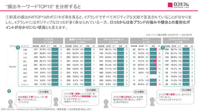 頻出キーワードTOP10のポジティブ / ネガティブ率を見ると、4ブランドですべてポジティブな文脈で言及されていることが分かりました。4ブランドにはポジティブな口コミが多く寄せられている一方、口コミからは各ブランドの強みや競合との差別化ポイントが分かりにくい状況とも言えます。レポートでは、その他のキーワードの分析から、競合との差別化を図るためのポイントを探っています。レポートは下記ページから無料でダウンロードできます。レポートをくわしく見る(無料)→ https://academy.kutikomi.com/whitepapers/202303_bridaljewelry/?utm_source=pressrelease&utm_medium=prtimes&utm_campaign=202303_bridaljewelry■ 口コミサイトを”もっと”売上に変える「口コミコム」とは