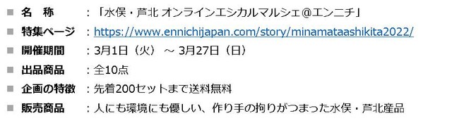 株式会社ふくおかフィナンシャルグループ(取締役会長兼社長 柴戸 隆成、以下「FFG」)傘下のiBankマーケティング株式会社(代表取締役社長 明石俊彦、以下「iBank社」)は、「地域総合商社事業」におけるオンラインストア「エンニチ」において、熊本県水俣・芦北地域の特産物のWeb販路拡大支援に資する取組みとして、『水俣・芦北 オンラインエシカルマルシェ、以下「本特集」』を開催いたします。
