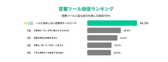 一方で「営業課題を解決するツールに最も魅力を感じる価値は何か」という問いに対しては、「一人に依存しない営業内チームワーク」が43.3%と最も多く挙げられました。次いでマネジメント観点での「全商談の今が手に取るようにわかる」(29.0%)、効率化観点での「営業の無駄な時間を半分にできる」(26.2%)が続いており、組織として成果を出せる仕組みへの期待が高まっていることが分かります。