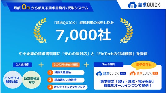総合フィンテックソリューション企業であるSBI FinTech Solutions株式会社の子会社で、バックオフィス支援サービスを提供するSBIビジネス・ソリューションズ株式会社(本社:東京都港区、代表取締役社長:夏川 雅貴、以下「当社」)は、中小企業の法対応と業務効率化をサポートするクラウド型請求書管理システム「請求QUICK」において、継続利用のお申し込み社数が7,000社を突破しましたので、お知らせいたします。