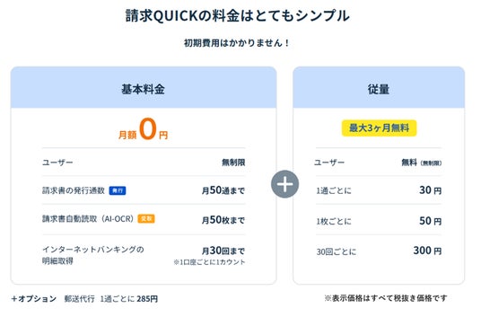 「請求QUICK」は、法制度対応と業務効率化を実現するクラウド型請求書管理システム(SaaS)をベースに3つのFinTech機能が組み込まれており、月額無料からご利用いただくことができます。金融機関とのAPI連携による自動明細取得機能で面倒な入出金の消込作業を大幅に効率化する「消込QUICK」、発行した請求書をクレジットカードでオンライン決済できる「クレカQUICK」、発行した請求書をWeb完結で資金化できるオンラインファクタリング「入金QUICK」という3つのFinTech機能を、すべて1つのシステムで提供しています。