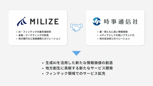 株式会社MILIZE(本社:東京都港区、代表取締役社長:田中 徹、以下「MILIZE」)と、株式会社時事通信社(本社:東京都中央区、代表取締役社長:境 克彦、以下「時事通信社」)は、2025年1月20日に資本業務提携を締結したことをお知らせします。本提携を通じて、AI・フィンテックの最先端技術と報道機関が保有・蓄積する記事とデータを組み合わせることで、次世代に向けたニュースによる新たな価値創造および地方創生に貢献する新たなサービス開発に取り組むこととなりました。
