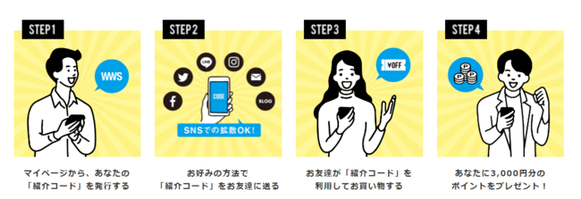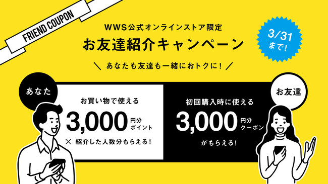 概 要:キャンペーン期間中にWWS公式オンラインストア会員登録者様が発行した紹介コードをご友人にシェアすると、紹介されたご友人はWWS公式オンラインストアでの初回購入が3,000円引きになります。ご友人が紹介コードを利用して購入完了すると、ご紹介者様にWWS公式オンラインストアで使用できる3,000円分のポイントが付与されます。