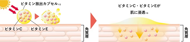 紫外線に反応しビタミンC・ビタミンEを放出して肌の乾燥をケアするビタミン放出カプセル※2を従来品に引き続き配合。紫外線ブロックと乾燥ダメージケアを同時に行えます。