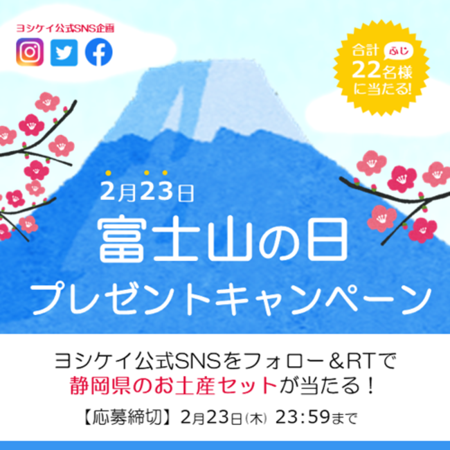 ヨシケイの発祥の地「静岡」を代表する富士山のように日本中で親しみ・愛されるよう、2/23の富士山(223)にあわせてプレゼントキャンペーンを実施。当選者には、静岡のお土産セットを22(ふじ)名様にプレゼントいたします。